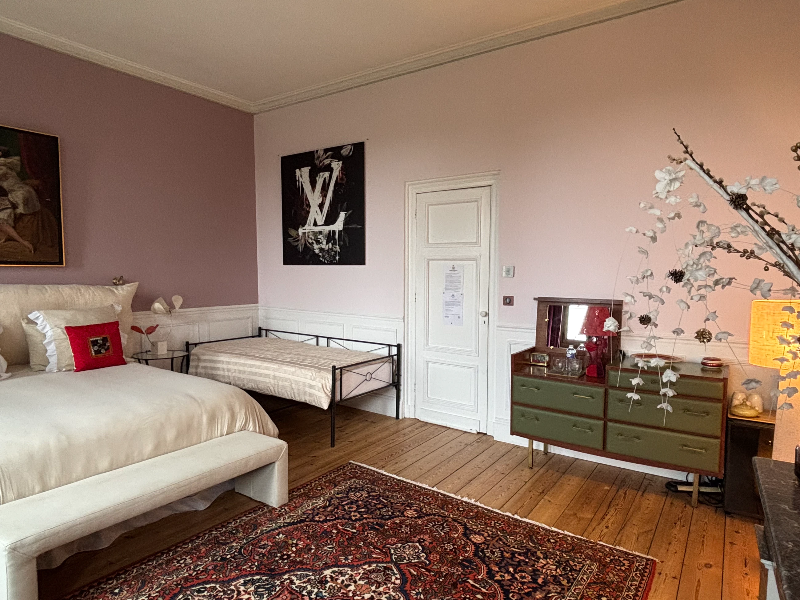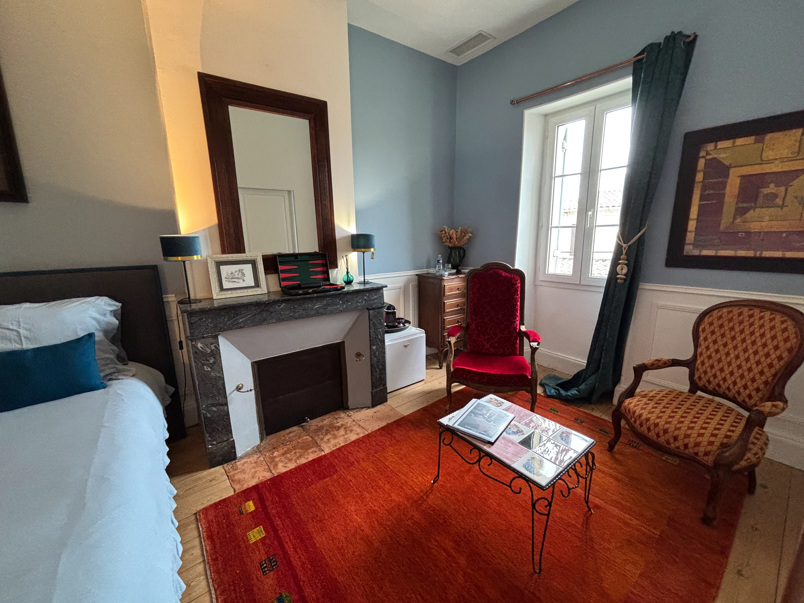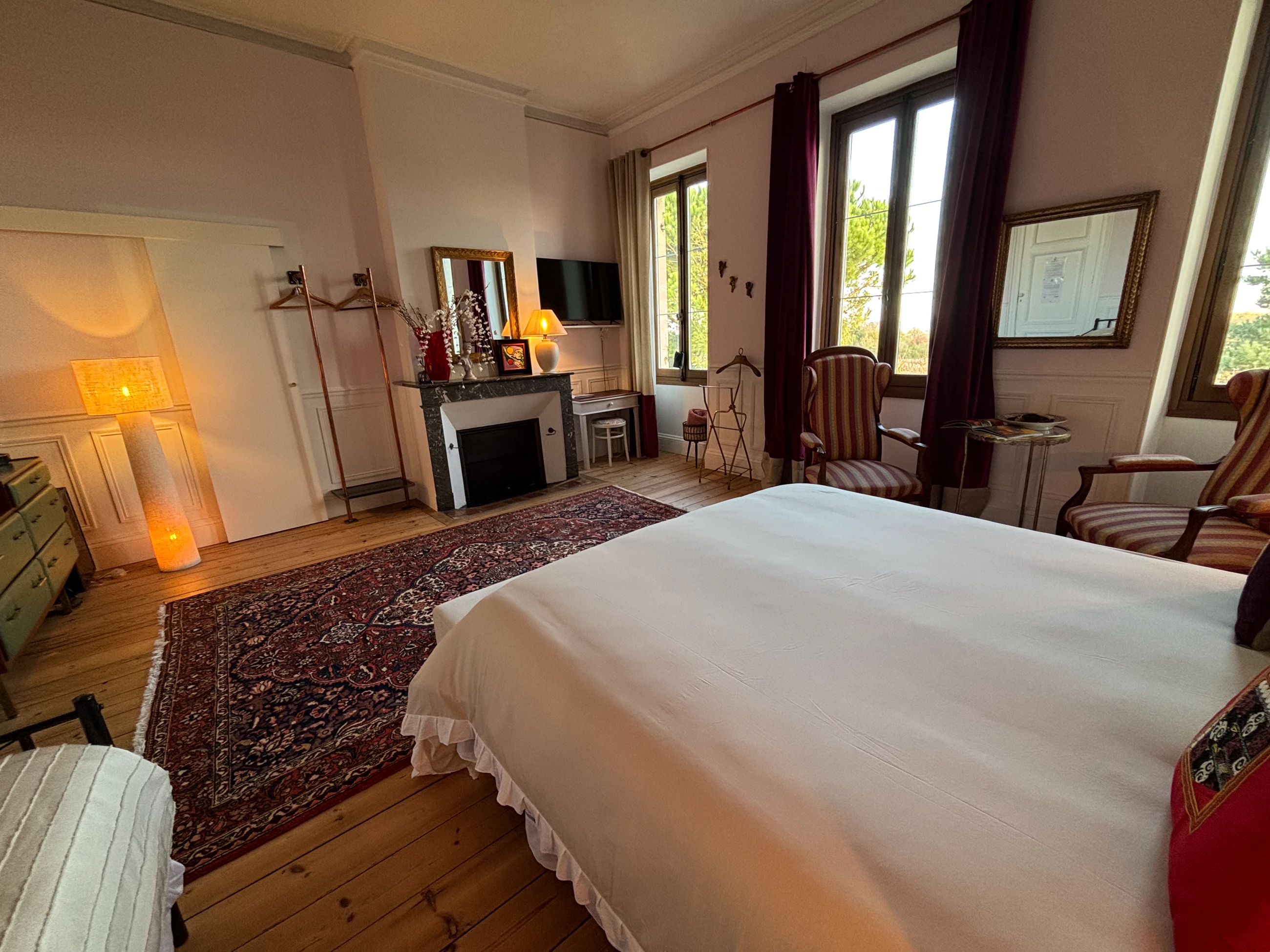 The Château Montrose room enjoys the morning sun through three tall windows overlooking the vineyards and the Gironde estuary. The Château Montrose room is a haven of peace and refinement. Both comfortable and authentic, it has retained its original charm while offering all modern amenities. Designed to accommodate families or friends with a queen-size bed and a single bed (90 × 200 cm), this triple room features a private bathroom.